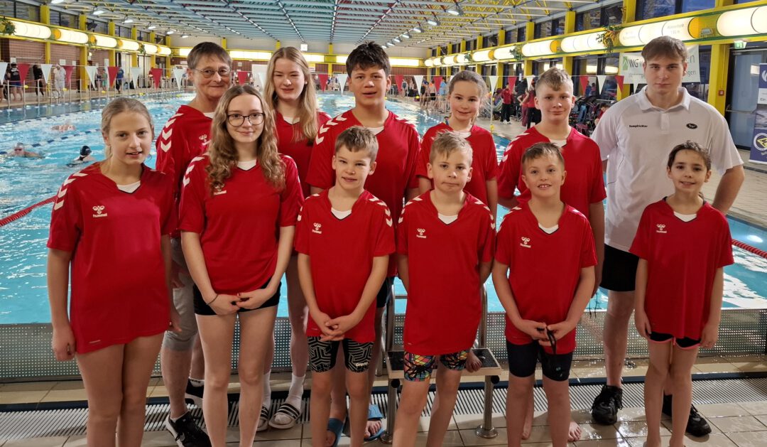Zwei Tage hieß es für zehn Aktive des TuS Ebstorfs auf der 50m Bahn ihr Können zu beweisen. Bei Emma Kinder (Jg. 2014), Lina Sokolowski (Jg. 2014) und dem jüngsten im Ebstorfer Team Johann Mecke (Jg. 2018), die alle erst seit 10 Monaten trainieren, war die Aufregung deutlich zu spüren. „Aber ihre Starts sind trotzdem gelungen und sie haben ihr Bestes gegeben!“, ist Trainerin Simone Lammert stolz. Während die Mädchen bei starker Konkurrenz aus den anderen Vereinen im Mittelfeld landeten, konnte sich Johann über 50m Brust die Goldmedaille sowie über 100m Freistil und 50m Rücken jeweils die Bronzemedaille sichern. Der ältesten Ebstorfer Teilnehmerin Marie Dörnbrack (Jg. 2009) gelang der Sprung aufs Treppchen gleich sechsmal. In ihrer Paradedisziplin Brust holte sie sich jeweils über die 200m, 100m und 50m die Goldmedaille, über 50m Freistil, 100m Freistil und 200m Lagen die Bronzemedaille. Hanna Großmann (Jg. 2000) erreichte in ihrer Paradedisziplin Schmetterling über 100m die Goldmedaille und über 50m die Silbermedaille sowie die Bronzemedaille über 100m Rücken. Weiterhin konnten sich Hauke Noje Knollmann (Jg. 2014) über eine Silbermedaille in 200m Brust, Torben Noje Knollmann (Jg. 2012) über eine Bronzemedaille in 200m Rücken, Willy Kallwitz (Jg. 2013) über eine Bronzemedaille in 100m Schmetterling und Sarah Lindner (Jg. 2017) über eine Silbermedaille in 50m Freistil freuen. Viele weitere Platzierungen lagen bei starker Konkurrenz auf Platz 4 sowie im Mittelfeld. „Wir sind sehr stolz auf unsere Schwimmer und ziehen ein positives Fazit, denn es hagelte zahlreiche Bestzeiten!“