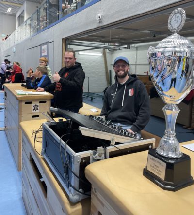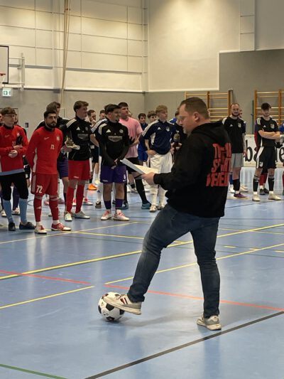 Der Siegerpokal stand glänzend auf dem Sprecherpult. Thies Harleß sorgte für sorgfältige Registrierung aller Tore, Fouls und sonstiger Besonderheiten und zählte am Schluss die Punkte zusammen. Denn nach packenden Spielen sollte es natürlich eine Siegerehrung mit Preisverleihung geben.